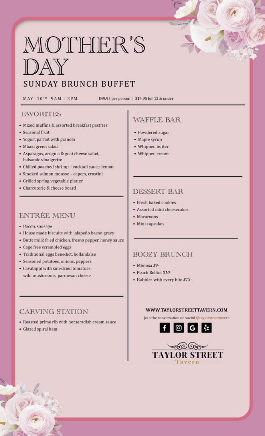 🗓 May 10th | 9AM–3PM 💲 Adults $49.95 | Kids 12 & under $14.95 🥂 Brunch Buffet Menu Only 📍 Taylor Street Tavern – Portland